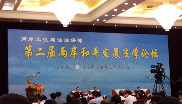 由海峽兩岸關係法學研究會(以下簡稱海研會)主辦的第二屆兩岸和平發展法學論壇14日在北京開幕。來自兩岸法學界、法律界的近200名學者將圍繞兩岸交往與法治保障這一主題,就如何進一步保障兩岸人民交往權益,包括司法權利、民商事權益、投資權益等進行為期兩天的研討交流。
