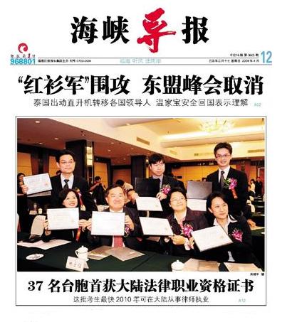 新聞主題:37名台胞首獲大陸法律職業資格證書
